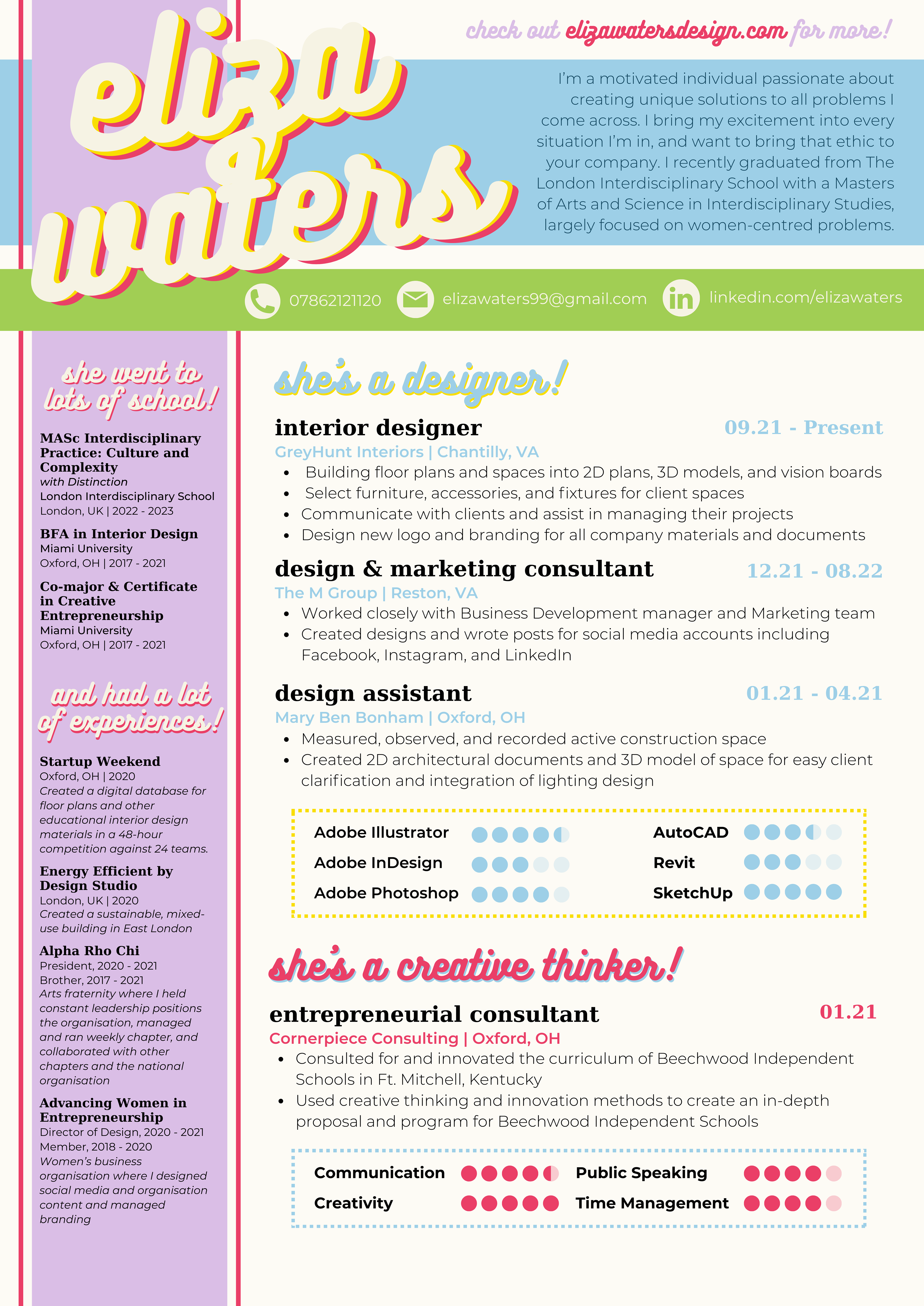 I am a 24-year-old recent graduate of the London Interdisciplinary School, where I largely focused on women's issues in America and around the world. I am currently residing in London, but I am originally from Washington, DC. I attended Miami University in Oxford, Ohio for my undergraduate degree in Interior Design, which also included a certificate in creative entrepreneurship. I have a passion for creating beauty, whether through graphics, interior design, or creative ideas and plans!