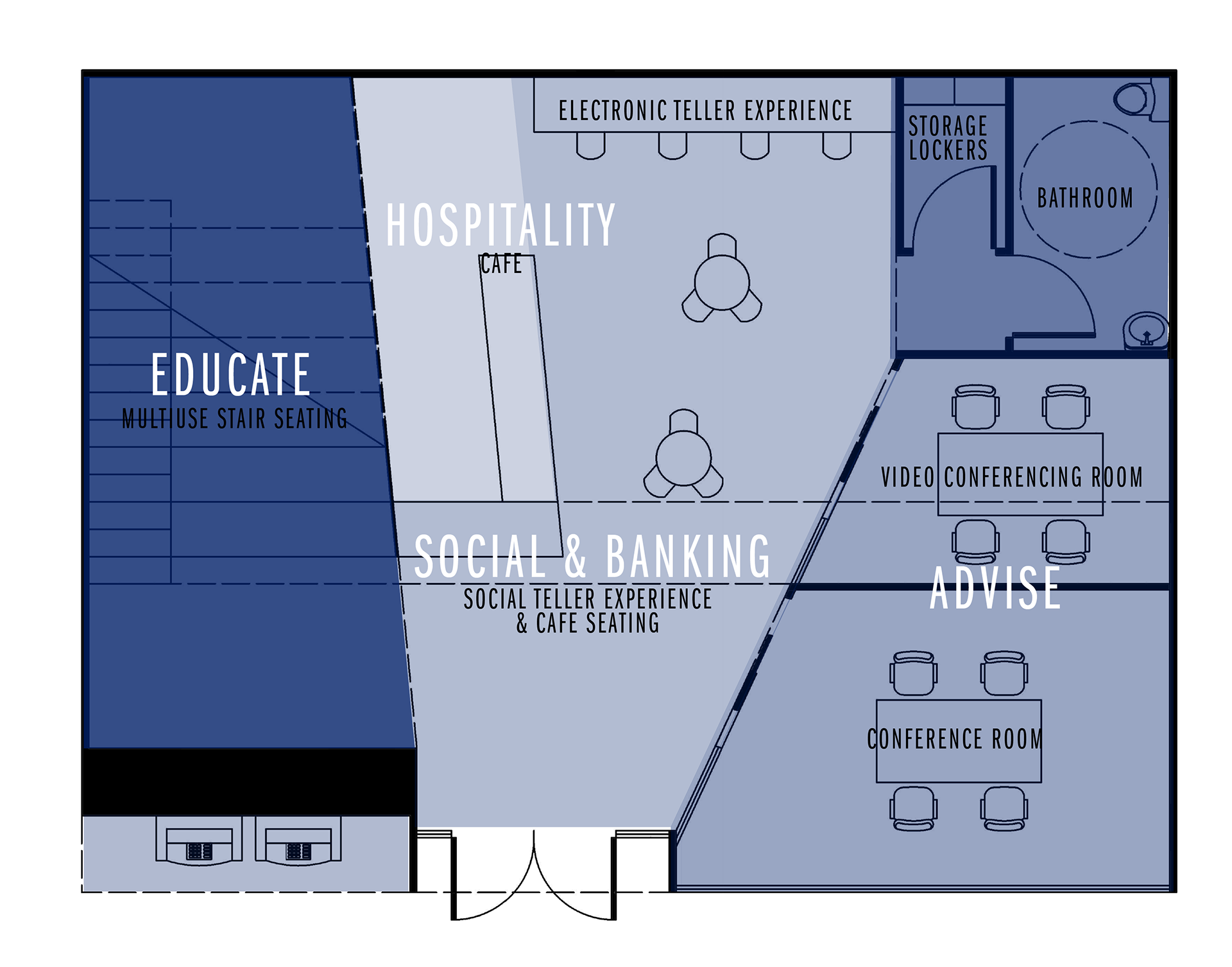 I worked with the concept of "social banking". To achieve this, I mixed my special program (a coffee bar) with my teller experience. Clients have the option of an impersonal experience by going to the tablets along the back wall or they can have a personalized and casual experience where they meet with the teller at the bistro tables.
